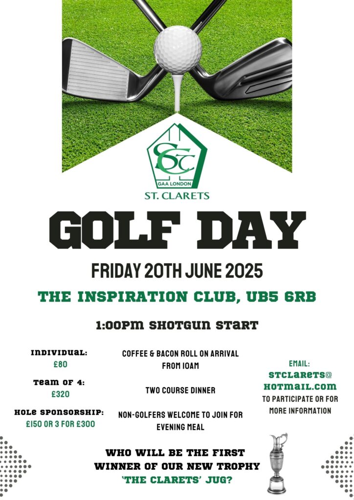 Who will be the inaugural winner of our golden anniversary specially commissioned ‘Clarets’ Jug? Category: newsBy Site AdminApril 5, 2025Share this post Share on XShare on X Pin itShare on Pinterest Share on FacebookShare on Facebook Share on LinkedInShare on LinkedInPost navigationPreviousPrevious post:St Clarets GFC events for 2025NextNext post:St Clarets 50th Anniversary Dinner Dance, Saturday 15th November 2025More Articles50th anniversary dinner dance celebrations at The Clayton, Chiswick, Saturday 15th Nov 2025November 10, 2025St Clarets men secure 2025 Shiels Cup title with a thrilling one point victory over Tara’sNovember 10, 2025Calling all Claretians: St Clarets GFC Social night, Friday 28th March, Ruislip GAA, 8pmApril 5, 2025St Clarets girls’ team raffleApril 5, 2025St Clarets 50th Anniversary Dinner Dance, Saturday 15th November 2025April 5, 2025St Clarets GFC events for 2025April 5, 2025